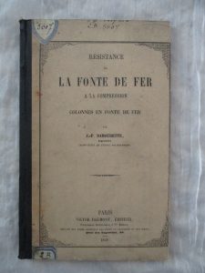 - DAMOURETTE (J.P). Résistance de la fonte de fer à la compression : colonnes en fonte de fer. Paris, Victor Dalmont, 1858. In-8, demi-toile muette postérieure, plats cartonnés de l'époque. 46-[2] pages, 3 planches en lithographie. Cachets de l'École d'application du génie maritime.