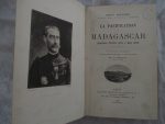- GALLIÉNI (Joseph-Simon). La pacification de Madagascar (Opérations d'octobre 1896 à Mars 1899). Paris, Librairie Militaire R. Chapelot, 1900. In-4, demi-basane prune (Étiquette du relieur Metz d'Hardivillier à Tunis). VII-528 pages, portrait-frontispice en héliogravure d'après une photographie d'Eugène Pirou, nombreuses cartes dépliantes ou à pleine page, avec indications colorées, planches hors texte en noir (reliure usagée).