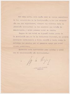 Directeur de la Bibliothèque nationale d’Argentine, Borges invite son correspondant à une réunion relative à la création d’une association des Amis de la Bibliothèque ; créée pour soutenir les acquisitions de la Bibliothèque, Borges propose que l’association ait aussi pour but d’enrichir le fond des pères fondateurs du pays, autour de Mariano Moreno. (…) La asociacion propenderia tambien al enriquecimiento de este centro de cultura, en lo que a obras se refiere, y al mejo remiento de su local, a fin de que la biblioteca pueda ofrecer las comodidades indispensables, nece sarias a los estudiosos que concurren a sus salas. Por otra parte, ella seria como un cuerpo consultivo de las autoridades de la institucion, a las que orientaria con sus sugestiones (…).