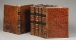 pièces d'auteur et de tomaison, caissons ornés, roulette dorée aux plats, double filet doré aux coupes, tranches marbrées (3 coiffes de tête découvertes, des coins frottés, rares auréoles marg. au t.1, l'atlas est affecté d'une forte mouillure qui a dégradé la reliure et touche toutes les cartes).