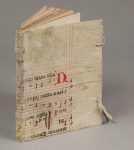 parchemin de réemploi avec notation musicale, lacets (lacunes soigneusement comblées au titre, sans manque de texte, une pl. déchirée sans manque, papier du texte bruni).