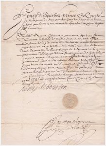 Henri de Ii Bourbon prince de Conde. 1588- 1646. Premier Prince de sang, Pair et Grand-Maitre de France, duc d’Enghien. P.S. « Henry de Bourbon », contresignée par « Perrault ». (Toulouse), 27 mai 1628. 1 pp. bi-feuillet in-folio, beau cachet