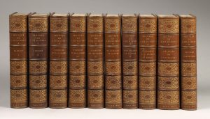 intérieure, tranches dorées [Hardy-Mennil] (large mouillure sur les plats en pied de chaque vol., étendue à l'intérieur - assez sérieusement sur 3 vol.).