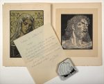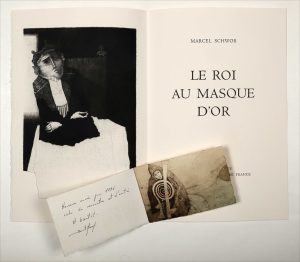 Tiré à 140 exemplaires numérotés sur vélin d'Arches signés par l'artiste : un des 25 réservés aux collaborateurs (n° XV), comprenant le menu d'un dîner du club illustré d'une eau-forte numérotée de signée. Enrichi de 2 cartes de vœux illustrés d'eaux-fortes avec envois autographes signés de l'artiste, et d'une épreuve d'artiste à grandes marges sur Japon impérial, justifiée, titrée " Le roi au masque d'or " et signée par Daniel Airam (papier coupé sans manque en pied de planche).