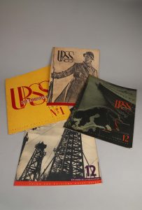URSS en construction. Revue mensuelle illustrée. Ensemble des cinq premières années. Moscou, Edition d'Etat de la RSFSR, 1930-1934. Chaque année se compose de 12 numéros, répartis entre 9 et 12 fascicules, soit 5 années complètes, en 54...