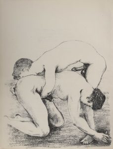 clandestine qui renferme un poème de jeunesse, suivi de " Femmes ", " Morale en raccourci ", " Hombres ", et le " Sonnet du trou du cul " ; illustrée de 18 compositions libres demeurées anonymes.