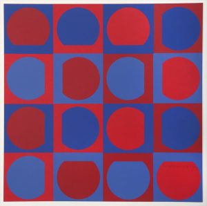 Victor VASARELY (1906-1997). Panderma 6 (carrés et cercles rouge et bleu). Sérigraphie signée en bas à droite, titrée au dos. 28 x 28 cm.