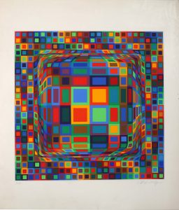 Victor VASARELY (1906-1997). [Carrés en relief multicolore]. Sérigraphie en couleur sur carton signée en bas à droite et annotée EA dans la marge au crayon. 50,8 x 50,8 cm. Feuillet : 72 x 62 cm. (Légères taches et éraflures, traces...