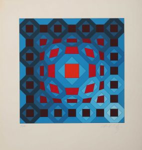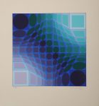 Victor VASARELY (1906-1997). [Compositions cinétiques en bleu, vert et rouge]. 2 sérigraphies sur papier signées dans la marge en bas à droite et annotées E A. 30 x 30 cm. Feuillet : 44,5 x 42 cm. (Jaunies et reports de sujet au verso).