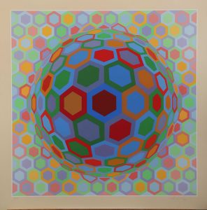 Victor VASARELY (1906-1997). [Sphère multicolore]. Sérigraphie en couleurs signée en bas à droite et justifiée II/XX. 65,5 x 65,5 cm. Feuillet : 75 x 75 cm. (Trous de punaise, mouillures, coins cassés).