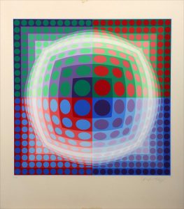 Victor VASARELY (1906-1997). [Sphère carrée]. Sérigraphie sur carton, signée en bas à droite et justifié 218/267. 58 x 58 cm. Feuillet : 77,5 x 67,5 cm. Mouillures dans les bords, légèrement jaunies.