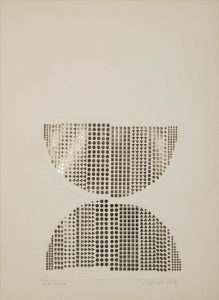Victor VASARELY (1906-1997). 2 sérigraphies. - [Pastilles dégradées noires, brunes et jaune dans un carré doré]. Signée et justifiée F.V 21/22. 10,5 x 10,5 cm. Feuillet : 26 x 25 cm. - [Sablier - Pastilles carrées, triangulaires et rondes...