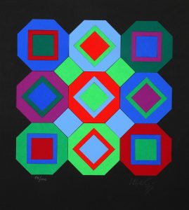 Victor VASARELY (1906-1997). 2 estampes. - OPALE. formes géométriques en couleurs sur fond gris, signée en bas à droite et justifiée E.A. XIII/XV. Feuillet : 37,8 x 27,3 cm. - [Octogones, losanges et carrés colorés sur fond noir]. Technique...