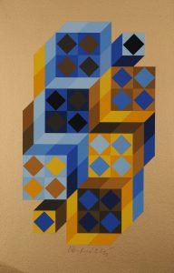 Victor VASARELY (1906-1997). TRIDIM GORDES . Pochoir en couleurs sur fond doré, signé en bas au centre. Etui "VASARELY CHATEAU DE GORDES VAUCLUSE 1970". Légère pliure dans l'angle inférieur gauche. 37 x 24 cm.