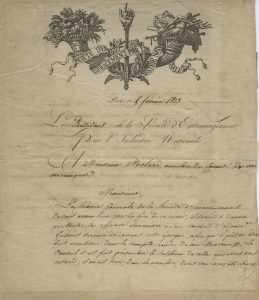 Société d’Encouragement pour l’Industrie nationale” avec belle et grande vignette, adresse au verso ; marge un peu coupée, petits renforts, mais bon état. Enqualité deprésident delaSociété d’Encouragement, Chaptal demande que le rapport des affaires soumises au conseil d’administration soit achevé pour la séance générale de la fin du mois, afin d’en faire mention « dans le compte-rendu des travaux. » Il poursuit : Le Conseil s’est fait présenter le tableau de celles qui sont en retard (…). Ce sont : 1° la presse d’imprimerie de M. Tarbé ; 2° une lettre de la Chambre consultative de Thiers qui proposait un prix pour la fabrication de la corne (…). Si ce rapport ne pourra être prêt, il demande de lui transmettre son opinion sur ses divers sujets.