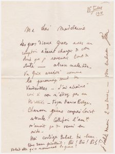 Les gros dieux grecs assis au comptoir étaient chargés de vous dire que je revenais tout de suite. Atroce malentendu (…). J’ai entrainé voir si vous n’étiez pas au the alliés foyer franco-belge. Chanson jeune, compère Loriot ridicule. Cette fois l’am(érique n’aurait pas du venir en aide. Hier cortège Babel très beau. Une dame piaillait : Bis ! Bis ! Bis ! Voulait-elle qu’on recommançât la guerre ? (…). Cocteau lui adresse son adresse.