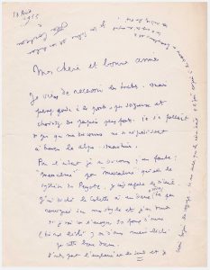 A propos de la rédaction de Colette. Il vient de recevoir les textes et leur conseille d’utiliser un papier plus fort avant de les envoyer. (…) Il s’en fallait de peu que mes discours ne se répartissent à travers les Alpes maritimes. Pour l’instant il ne trouve qu’une faute à corriger. J’ai dicté le Colette à une dame à Nice, très peu renseignée sur mon style et je me demande si je vais l’envoyer sous forme d’ours (très mal léché) ou d’ours mieux léché par cette brave dame. D’autre part, l’exemplaire est le seul (…).