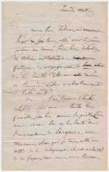 Rarissime lettre de Daumier à son épouse (Marie- Alexandrine Dassy dite Didine), dans laquelle il fait part de sa visite à sa mère, lui ayant raconté tous les détails de leur installation, les fatigues du voyages et le bon état de sa santé. (…) J’ai trouvé Chibi établi chez moi. Toute la famille et les miens se portent bien. Nous avons bu à la santé des Baigneuses de Langrune avec Muraire chez qui je suis allé au sortir de la diligence. Il est enchanté de la façon dont vous vous trouvez établis (…).C’est aujourd’hui lundi. Je vais m’atteler à la pierre et veiller au grain (…). Il a été beaucoup moins fatigué de ce second voyage et embrasse Mme Muraire, Jeny et Léon Muraire. Publié dans la biographie de Muraire par Escholier, d’après la coll. Geoffroy-Dechaume.