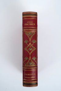 COUVREUR (André).?Caresco, Surhomme ou le voyage en Eucrasie.?Conte humain.?Illustré par Edmond Malassis.?Paris, librairie Plon s. d.?(ca 1900). pt in-8. 1/2 maroquin rouge vif à coins, décor Modern'Styl, doré et mosaïqué, tête dor., couv.?et...