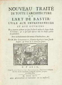 CORDEMOY (J. L. de) - Nouveau traité de toute l'architecture, ou l'Art de bastir utile au entrepreneurs et aux ouvriers. A Paris, chez Jean-Baptiste Coignard, 1714, in-4, veau fauve marbré, dos à nerfs orné, filets dorés en encadrement sur les...