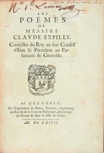 EXPILLY (Claude) - Les Poemes de messire Claude Expilly. A Grenoble, de l' imprimerie de Verdier, 1624, grand in-8, maroquin bordeaux, dos à nerfs orné, triple filet doré encadrant les plats, décor doré au centre des plats, dentelle...