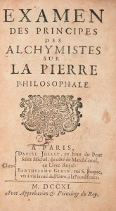 [POUSSE (François)] - Examen des principes des alchymistes sur la pierre philosophale. A Paris, chez Jollet, Girin, 1711, in-12, veau brun marbré, dos lisse orné, tranches rouges (reliure de l' époque).