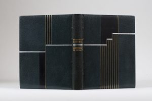 In-4, maroquin bleu canard, composition de maroquin et veau noirs sertis de filets dorés et de bandes au palladium, dos lisse, doublures de moire bleu nuit encadrées de filets dorés, listels de maroquin noir et bandes au palladium, gardes de même moire, doubles gardes, couverture et dos, tranches dorées sur témoins, étui (G. de Léotard. 1928).