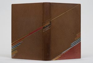 Grand in-8, maroquin ocre, premier plat orné d'un compartiment de veau rouge sertis de filets et de bandes dorées et au palladium, et de listels de veaux rouge et vert, second plat orné d'un décor composé de bandes dorées et au palladium, et de listels de veaux rouge et vert se prolongeant sur le dos, dos lisse, doublures de veau rouge ornées d'une bande dorées ou au palladium, gardes de moire ocre, doubles gardes, tranches dorées sur témoins, couverture et dos (G. de Léotard. 1928).