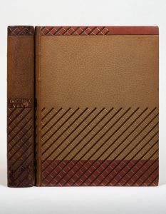 2 volumes in-4, maroquin havane, bandes de veau brique mosaïqué sur les parties supérieure et inférieure des plats, décors de treillis composés listels de maroquin brun et de filets dorés parcourant une partie des plats et du dos, dos lisse, doublures bord à bord de veau brique sertis de filets dorés et à froid, gardes de moire havane, doubles gardes, tranches dorées sur témoins, couverture et dos (G. de Léotard. 1931).