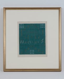 Dessin original à la gouache bleu canard, or et argent ayant servi de maquette pour la réalisation des dos de la série de reliures du Théâtre de Marivaux paru en 5 volumes en 1929 et 1930.