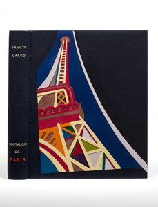 In-4, maroquin bleu, premier plat orné d'une Tour Eiffel vue en contre-plongée composée de nombreuses pièces de maroquins de différentes couleurs mosaïqués, dos lisse, doublures et gardes de papier japon bleu, tête mouchetée, non rogné, couverture et dos, emboîtage (J. Reyssat).