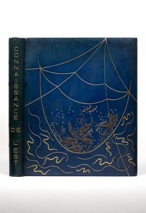 In-4, veau bleu, grand décor de filets dorés courbes et ondulés évoquant la pêche de poissons au filet, poissons de matière transparente ornée de paillettes dorés et argentés, dos lisse, doublures de veau vert, gardes en soie verte, doubles gardes, tranches dorées sur témoins, couverture et dos (Vtesse G. de Mentque).