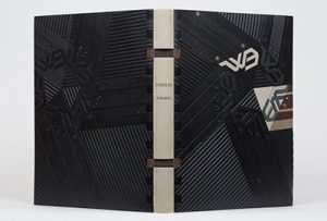 In-4, reliure révorim, plats en polyuréthane moulé noir ornés du chiffre cinq fois répété de la Bibliotheca Wittockiana formant un pentagone, décor au premier plat de pièces de veaux gris, beige, sable et brun, avec deux têtes de vis en métal, dos de box beige, doublures de daim lavande, couverture illustrée et dos, chemise et étui (Jean de Gonet Revorim, Atelier Antonio P[erez]-N[oriega]. 1987).