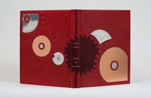 In-8, chagrin rouge, décor d'engrenages à froid ornés en leur centre de plaques de métal cuivré et argenté, engrenage de chagrin mosaïqué parcourant les plats et le dos, dos lisse, tête mouchetée, non rogné, couverture et dos, emboîtage (J. Reyssat).