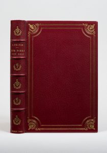 In-4, maroquin rouge, triple et double filets dorés, faisceau de licteur aux angles, dos orné de faisceaux de licteur et de bonnets phrygiens mosaïqués, filets intérieurs, doublures et gardes de tissu bordeaux, doubles gardes, tranches dorées sur témoins, couverture et dos, étui (G. Mercier Sr de son père - 1928).