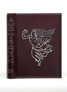 In-4, maroquin bordeaux, motif en étain ajouré au premier plat reprenant le bois de Mariano Andreu pour le personnage d'Alcmène, dos lisse portant le titre en long au palladium, doublures bord à bord de veau céladon, gardes de moire grège, doubles gardes, tranches argentées sur témoins, couverture et dos, chemise et étui (Vtesse G. de Mentque).
