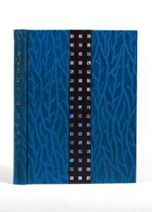 Petit in-8, basane bleue avec des veinures plus claires, bandeau vertical en basane noire ornée de trois rangées de petits carrés irisés sur les plats, non rogné, couverture décorée au pochoir, étui (Leroux). Catalogue d'une exposition à la Librairie Patrick Guillou, orné de reproductions photographiques.