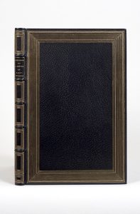 In-4, maroquin bleu, riche encadrement de multiples filets dorés et de deux listels de maroquin gris mosaïqué, dos orné de même aux compartiments, doublures de maroquin gris ornée de filets dorés et à froid, gardes de moire bleue, tranches dorées sur témoins, couverture et dos, chemise et étui (Huser). Édition illustrée de 4 eaux-fortes originales et 30 bois dans le texte par Auguste Lepère.