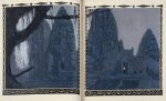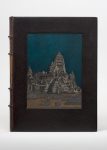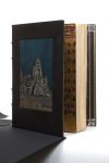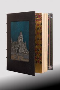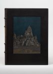 In-4, maroquin noir, vues de temples de maroquins bleu, gris, noir et ocre mosaïqués, différentes sur chaque plat et le dos, celle au second plat reprennant une composition de l'ouvrage, doublures de soie verte brochée à motif floral rose, or et noir, cadres de maroquin vert orné de listels de maroquin ocre et d'un listel discontinu de maroquin grenat, fleurons aux angles et filets au palladium, gardes de soie dorée brochée de motifs rouge et vert répétés, doubles gardes, tranches dorées sur témoins, couverture et dos, étui (Henri Blanchetière).
