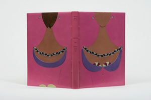 In-12, box rose orné sur le premier plat d'un buste de femme de maroquin mosaïqué brun, habillé de box violet, vert et fuchsia, collier de perles noires, argentées et dorés ornant le buste, cercles de perles argentées et dorées de part et d'autre du visage formant boucles d'oreilles, trois perles plates et un filet à froid figurant la taille, au second plat, même composition vue de dos, dos lisse, doublures de box rose, gardes de daim saumon, non rogné, couverture et dos, chemise et étui (M[onique] M[athieu], 1979).