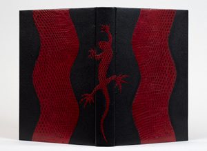 In-8, maroquin noir orné d'une large bande verticale ondulée de cuir rouge simili reptile, dos lisse orné d'un lézard de cuir rouge simili reptile dont les pattes se prolongent sur les plats, tête mouchetée, non rogné, doublures et gardes de papier japon, couverture et dos, emboîtage (J. Reyssat).