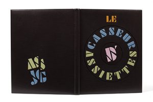 In-4, cuir de Russie brun, premier plat orné d'une composition en forme d'assiette composée de deux filets circulaires en creux et ornée du titre en lettrage de box orange, bleu, rose et vert, second plat orné des initiales de l'auteur et de l'artiste en box vert et bleu, dos lisse muet, doublures et gardes de daim brun ornées de petits triangles poinçonnés laissant apparaître un papier argenté, non rogné, couverture et dos, chemise à rabats portant le titre avec les couleurs de la reliure, étui (A[lain] Devauchelle - 2005).