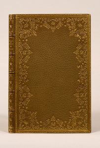 Petit in-4, maroquin vert olive, filets, roulette et large dentelle dorée aux petits fers en encadrement, dos orné, guirlande dorée intérieure, doublures et gardes de soie brochée, doubles gardes de papier, tranches dorées, couverture et dos, étui (M[arcellin] Lortic).