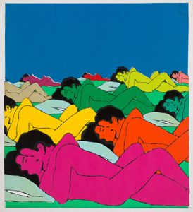 Collage aux couleurs vives (bleu, violet, vert, orange, rouge, etc.), représentant un couple couché reproduits sur différents plans en plusieurs couleurs.