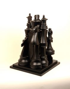 Accumulation de grandes pièces d'échec en résine découpées et réassemblées ensemble sur une base carrée, signée et numérotée 60/70.