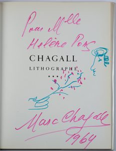 l'un de la part de l'artiste au feutre rose « Pour Melle Hélène Pons. Marc Chagall 1964 » orné d'un dessin en rose et bleu ;