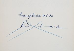 Tirage à 90 exemplaires numérotés et signés par Paul Éluard, celui-ci un des 65 sur vélin du Marais.