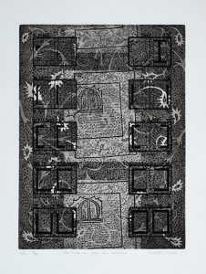 Jolie suite de sept gravures en techniques mixtes de Marjon Mudde constituant un hommage aux maîtres-scribes et aux maîtres-enlumineurs anonymes du Moyen-Age.