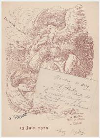 Menu imprimé illustrant un dessin d’Adolphe WILLETTE « Hommage à Rodin, élève de Dieu », portant la signature de Wilette et celle de Rodin. Joint : carte de visite autographe signée de Rodin, à M. Méry pour lequel il remet à plus tard l’étude de la question bronze (…). Joint 2 enveloppes avec adresse autographe de Rodin.