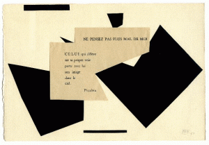 Texte de Pierre-André Benoît: «Prenez une bonne cuite et tout ira bien» illustré au verso de petits collages signés par PAB.